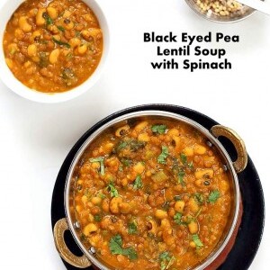 Easy Lentil Black Eyed Pea soup with Spinach. Masoor Raungi Palak Dal. Easy spiced protein filled soup. Vegan Gluten-free Soy-free Indian Recipe. Serves 3 to 4