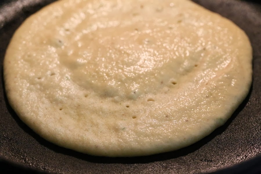 - Heat a pan on medium heat. Grease it if needed. Drop a ladle of the batter Spread with the ladle or by tapping the pan. Drizzle a few drops of oil on the edges. Let cook for 3-5 minutes or until golden at the bottom. Flip and cook for another 2-3 minutes. Serve as is (they are delicious as is too), or with the blackened veggies and dressing..