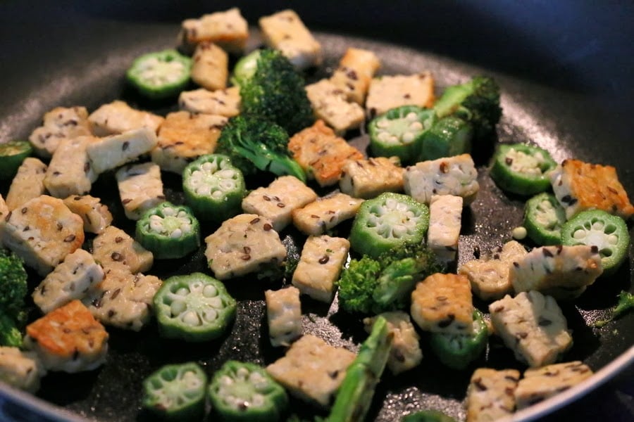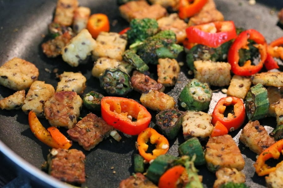 - In a pan, heat oil on medium high. Add the chopped Okra and Tempeh and cook for 6-7 minutes (stir occasionally). Add broccoli and peppers, reduce heat to medium and continue cooking until okra is crisp and Tempeh is evenly brown(10+ minutes). Stir occasionally. Add the blackening spice, garlic and salt and cook for another 1-3 minutes.