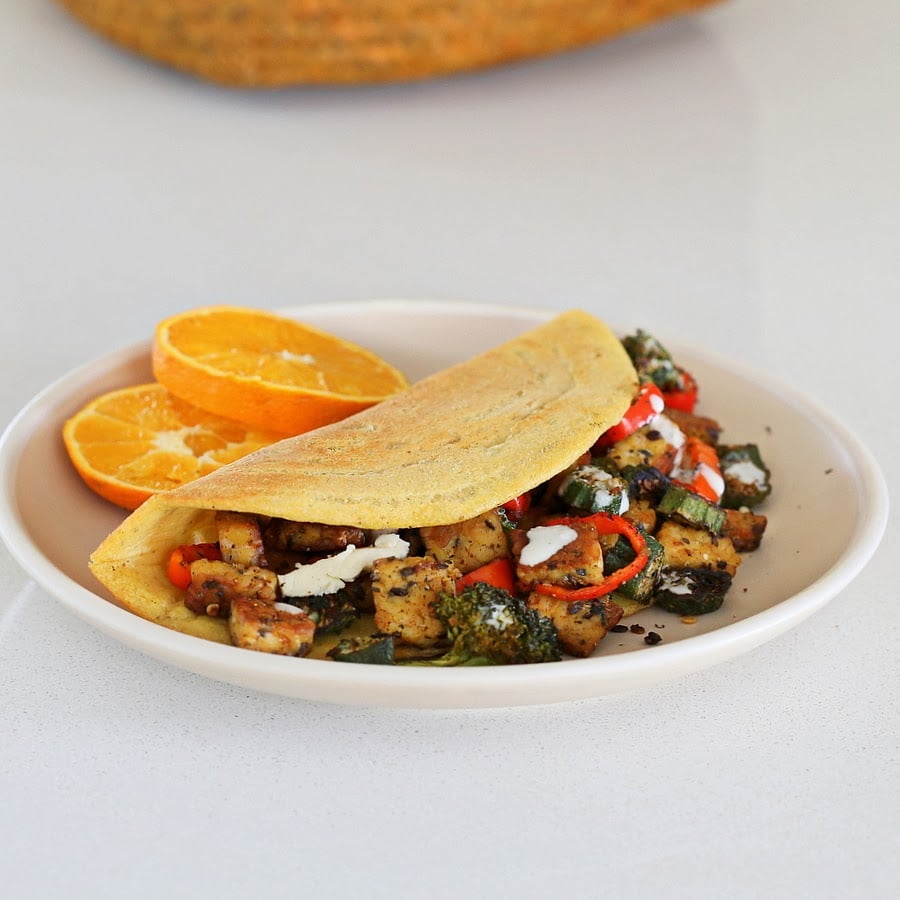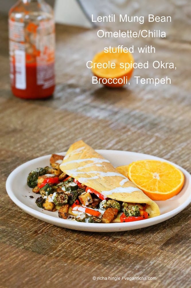 Lentil Mung Bean Omelettes/Pancakes Stuffed with Blackened Okra, Tempeh and Broccoli