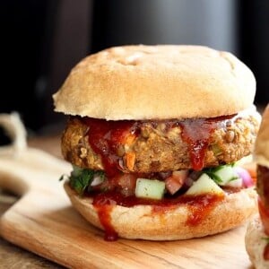 I made up my own BBQ sauce and from all other vegan burgers or meatloafs in the past they always came out too dry. By adding the glaze to the burger recipe and a brush on the patties before baking them made them so amazing.