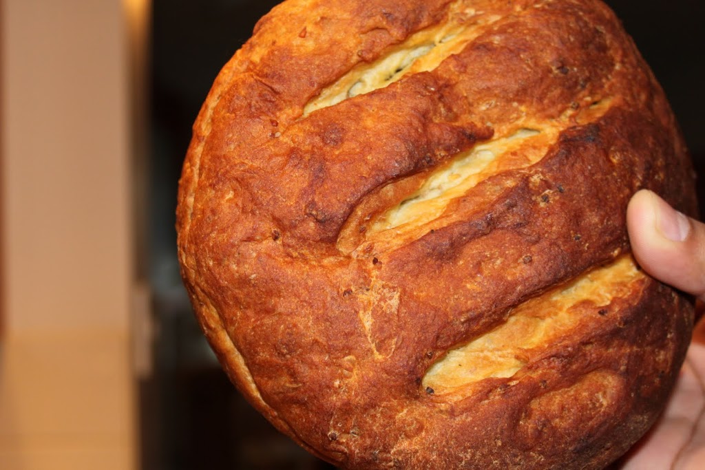 - Place dough in bread pan or round pan and score the top. Spritz top with water, then with oil.