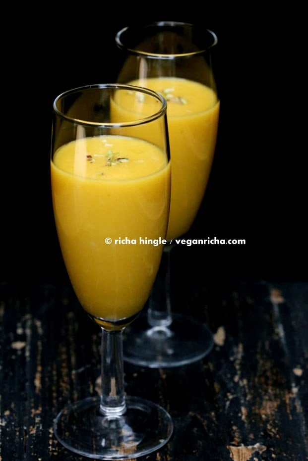 Vegan mango Lassi - Indian Mango Yogurt smoothie with ripe mango, non dairy yogurt and cardamom or saffron. Dairy-free, gluten-free.