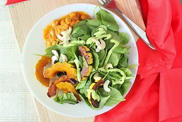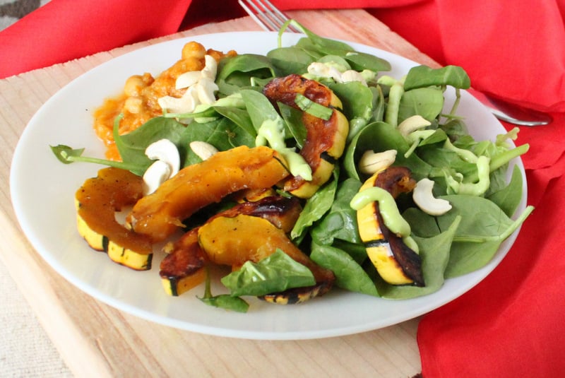 Maple Glazed Delicata Squash, Cashews, Baby Spinach Salad With Creamy Wasabi Dressing. Vegan And Gluten Free Recipe. Jump to Recipe