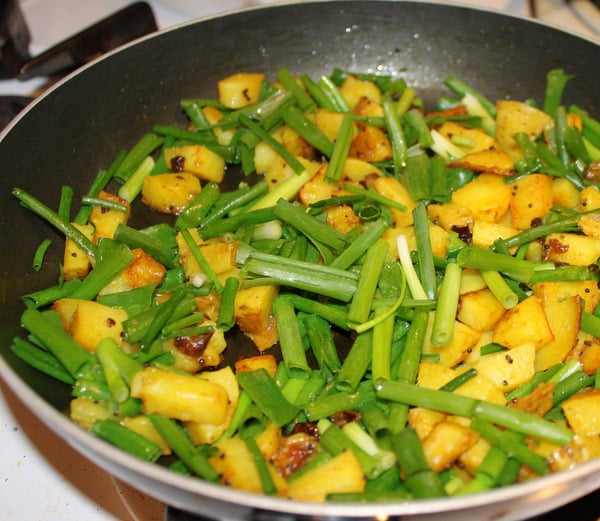 - Mix well to coat. Add in the green onions as well along with the salt and turmeric and mix well. Cook on low heat for 6-8 minutes since the potatoes are already cooked. The green onions look fresher and retain their shape when cooked this way! Have a fun day!