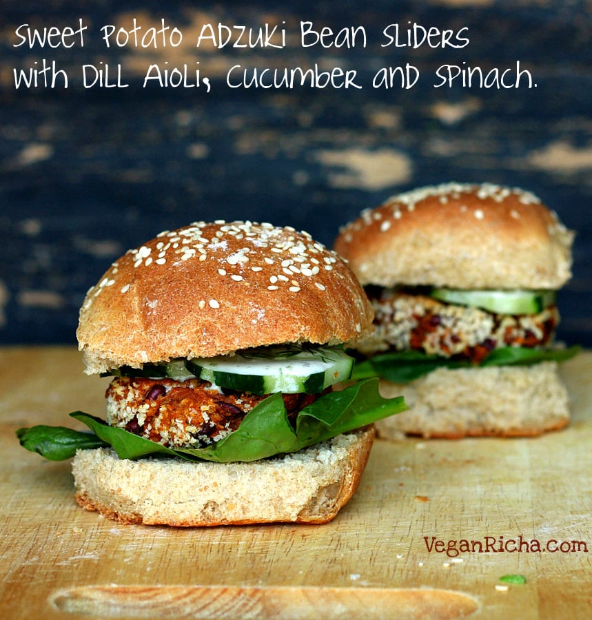 Or pass these prettyย Sweet Potato adzuki bean slidersย around. Dill Aioli check, cucumbers check.