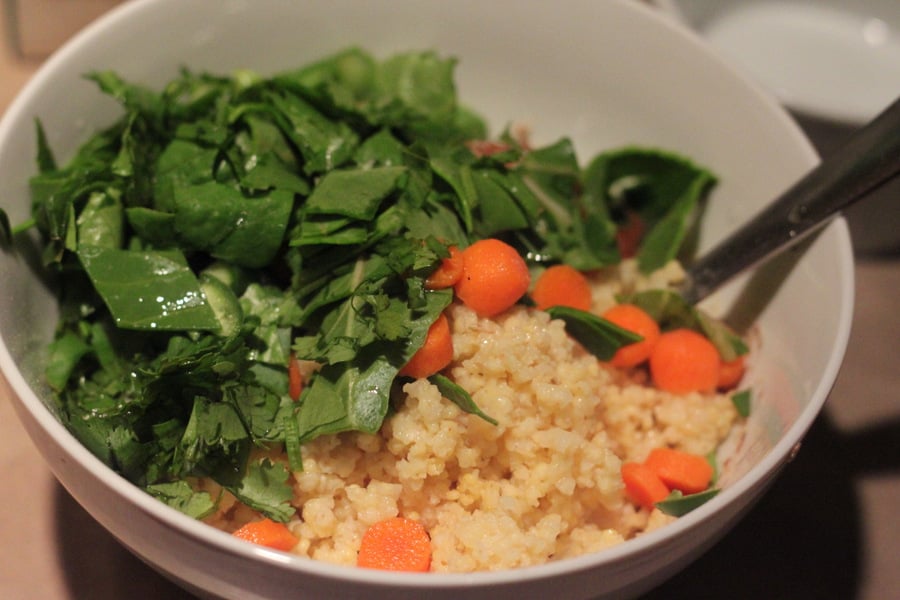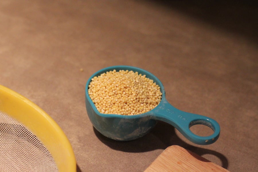 Wash and cook 1/4 cup millet in 2/3 cup vegetable broth, or water with added salt and dried herbs.(3/4 cup water if you want the millet a bit mushy). Bring to a boil. Reduce heat to low, cover and cook until well done(15 minutes or so). Mix once in between. Fluff when done.
