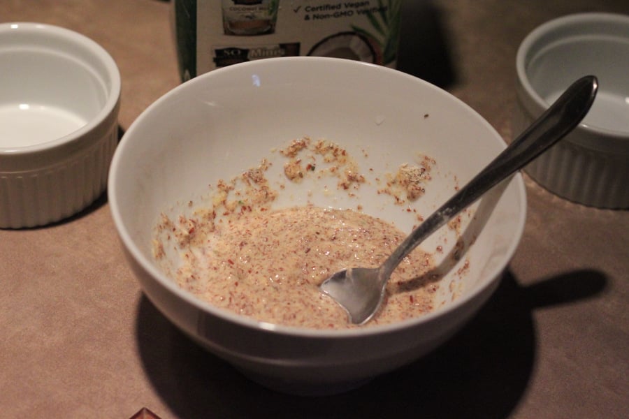 Distribute the mixture into ramekins. I used three 3.5 inch ramekins. Use a spoon to even the tops.
