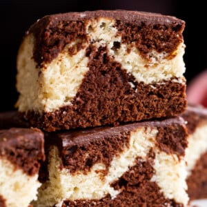 Use 3/4 cup of milk in the marble cake. Once you mix in the milk into the dry mixture add in ¼ to 1/3 cup of club soda and lightly mix in. Then proceed with making the two batters and alternatively layering it into the marble effect.