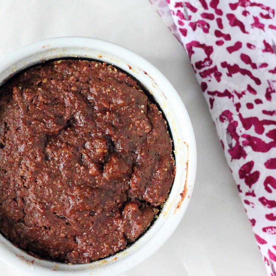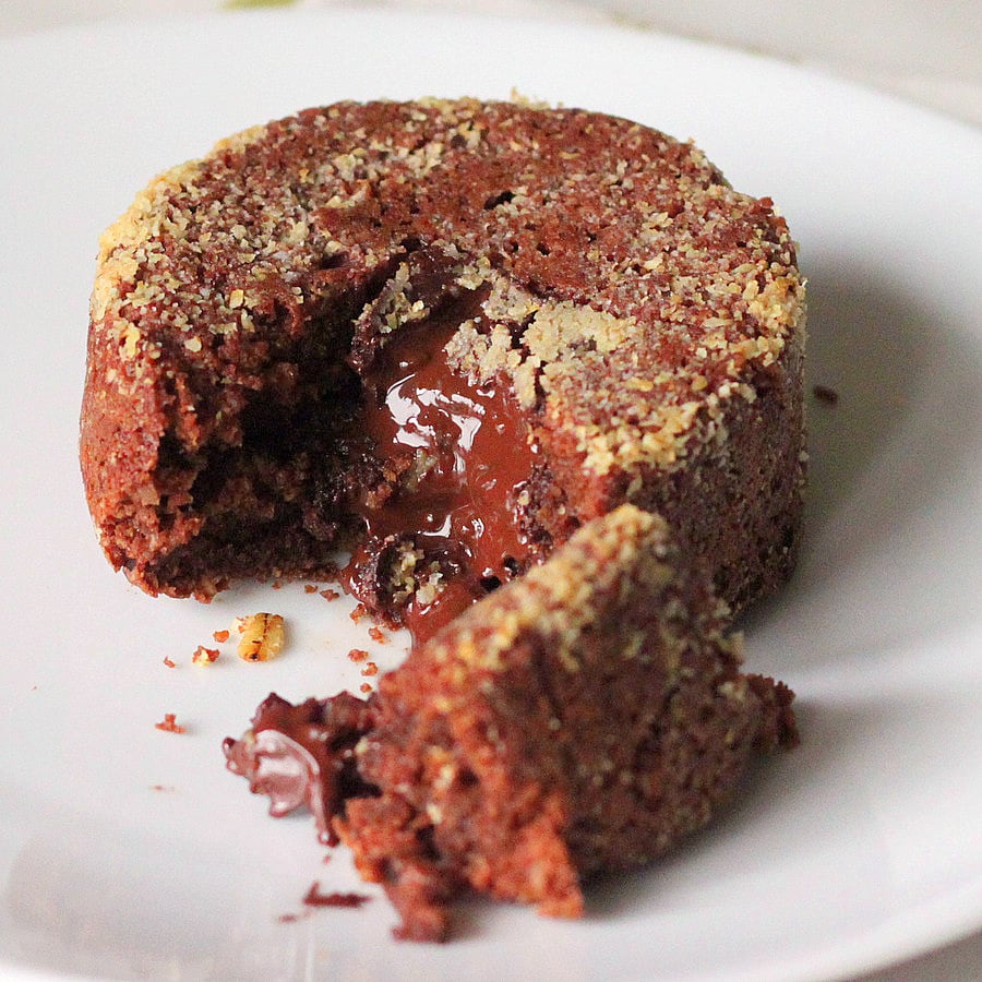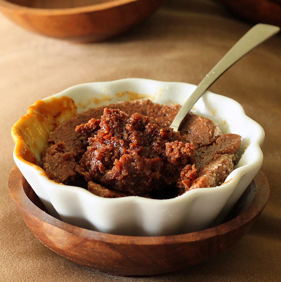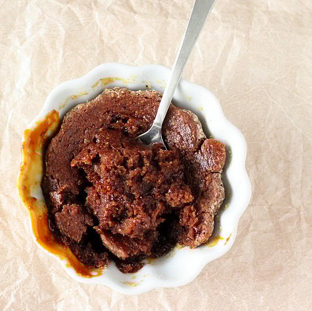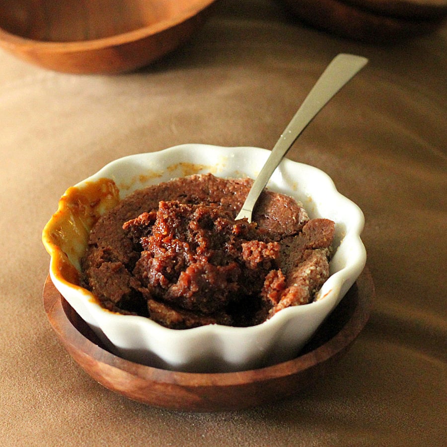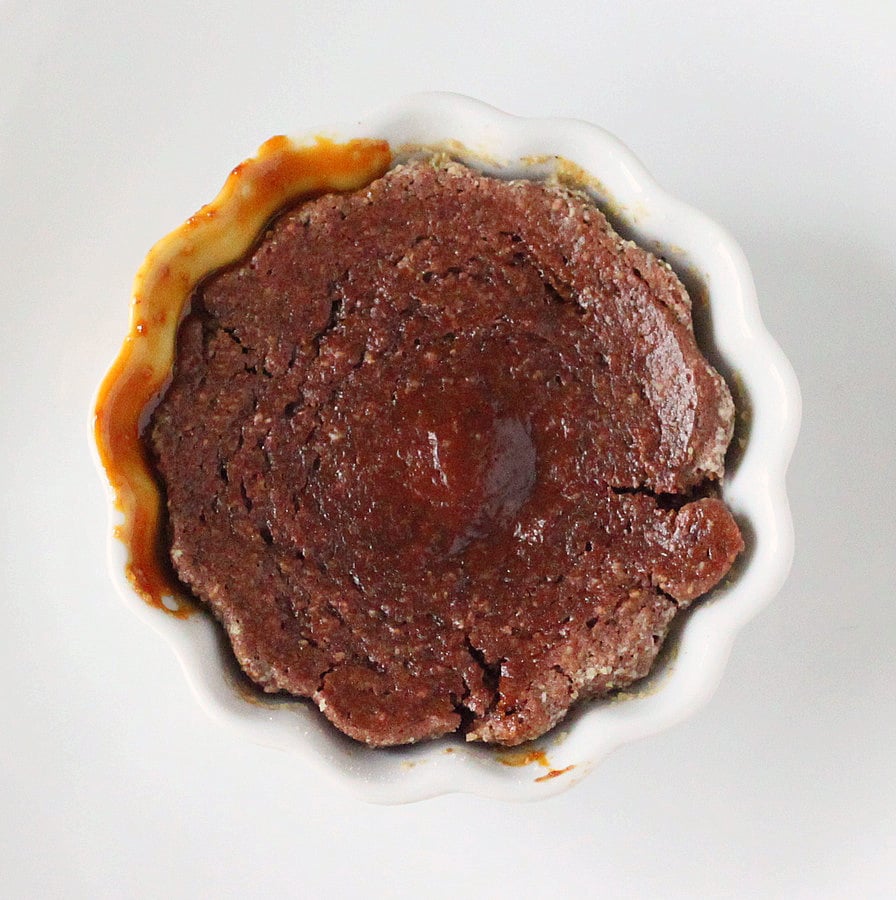 For the Caramel version, put half the batter in the ramekin, then some vegan caramel candy or thick syrup (I used salted Caramel from Hot Cakes) in the middle and top with the remaining batter. Bake for 12-13 minutes.