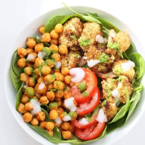 - Arrange the roasted cauliflower, spiced chickpeas, greens and veggies. Drizzle the herb sauce. Drizzle non dairy yogurt if using. Add red pepper flakes, slivered almonds. Serve.