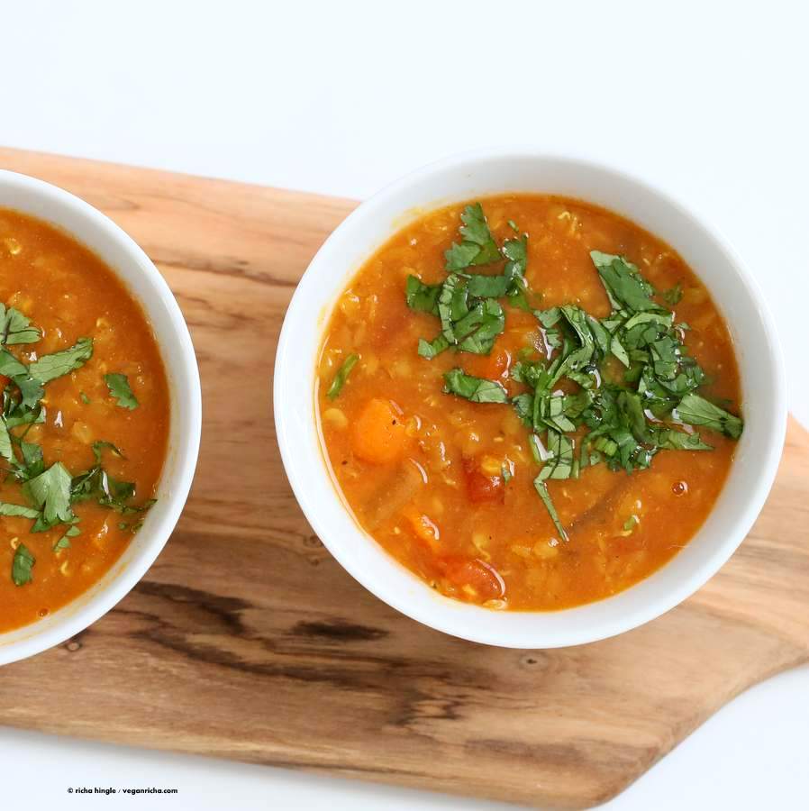 - Heat 1/4 cup of the vegetable broth in a large soup pot over medium-high heat. Add the onion, carrot, and garlic and sauté, adding additional broth as necessary to keep the vegetables from burning. Sauté until the onions are softened and translucent, about 5 minutes. Add the coriander, cumin, turmeric, smoked paprika, cinnamon, and ground ginger. Sauté the vegetables and seasonings for 1 to 2 minutes to allow the flavors to bloom. Add the remaining vegetable broth, crushed tomatoes, and lentils and bring to a boil.