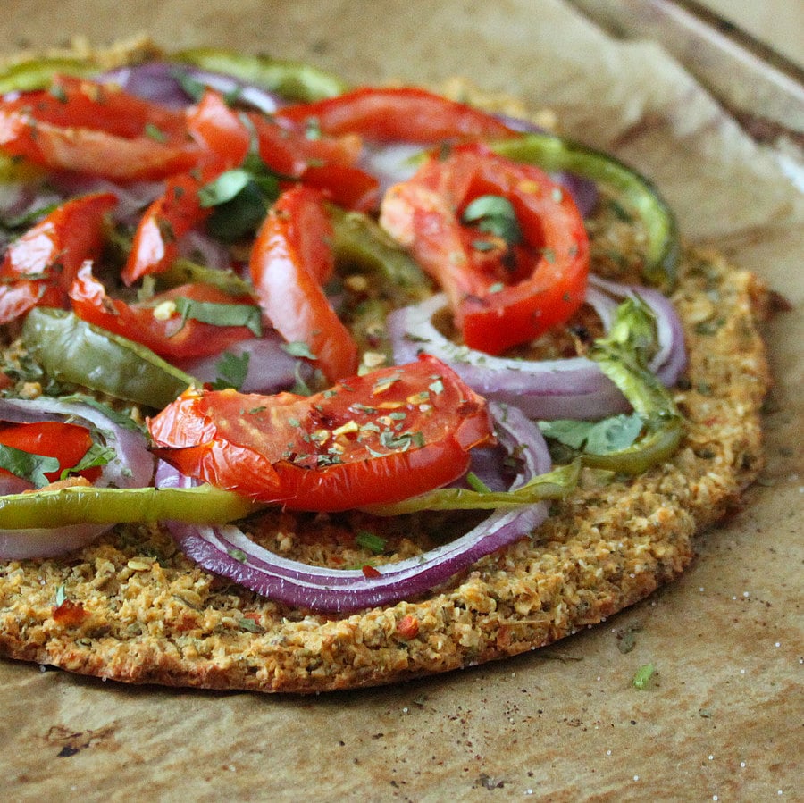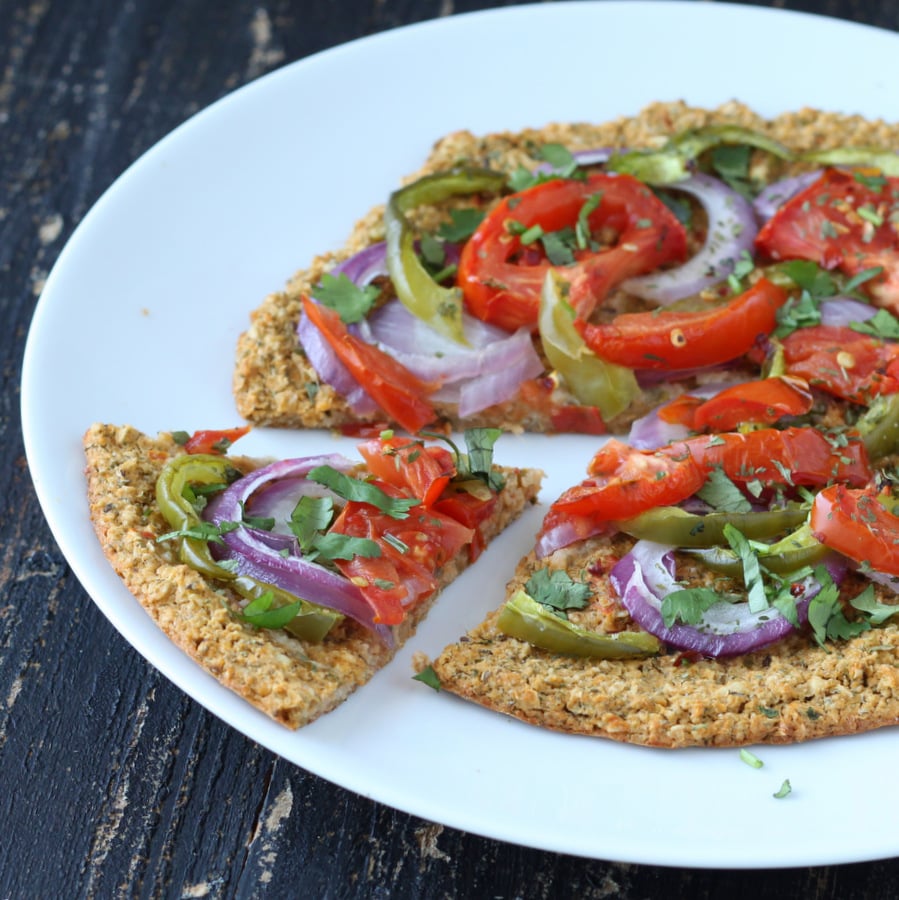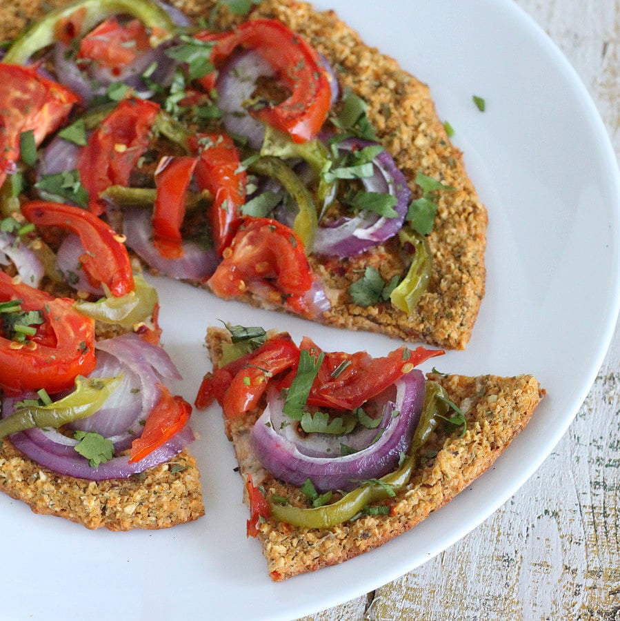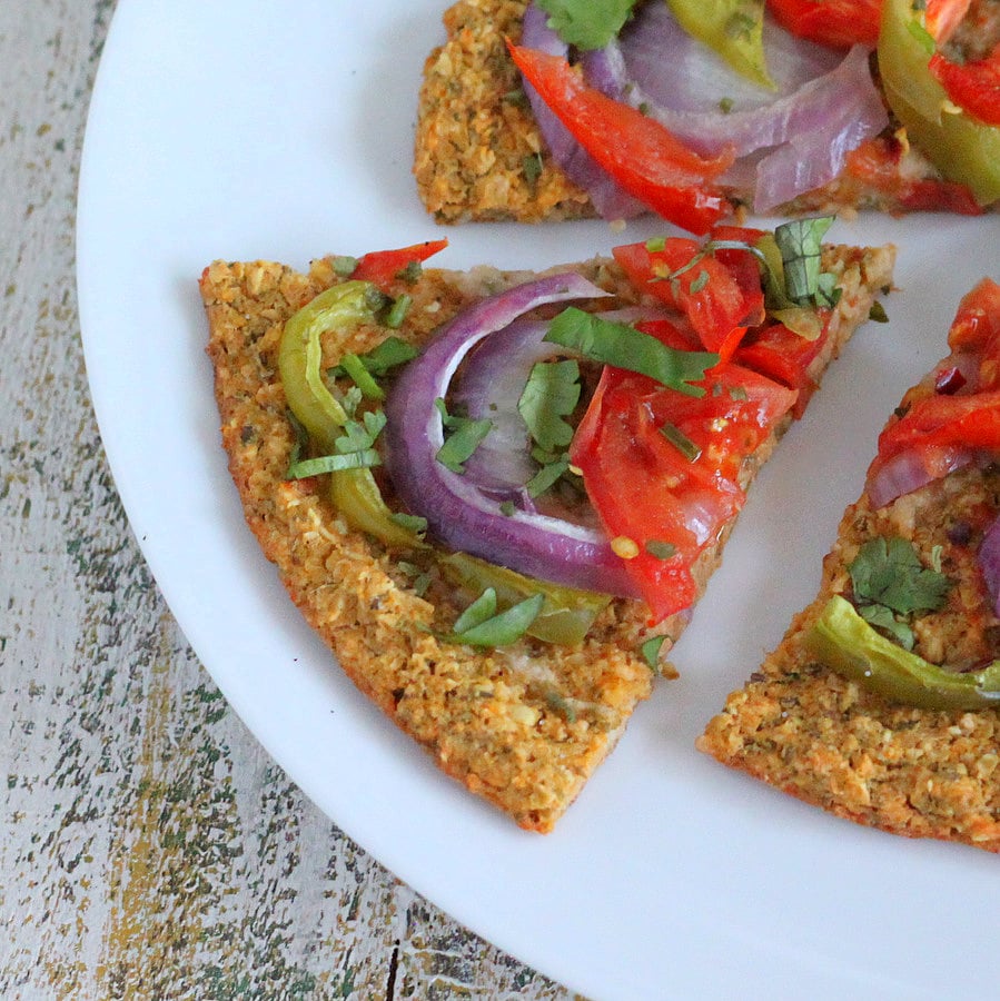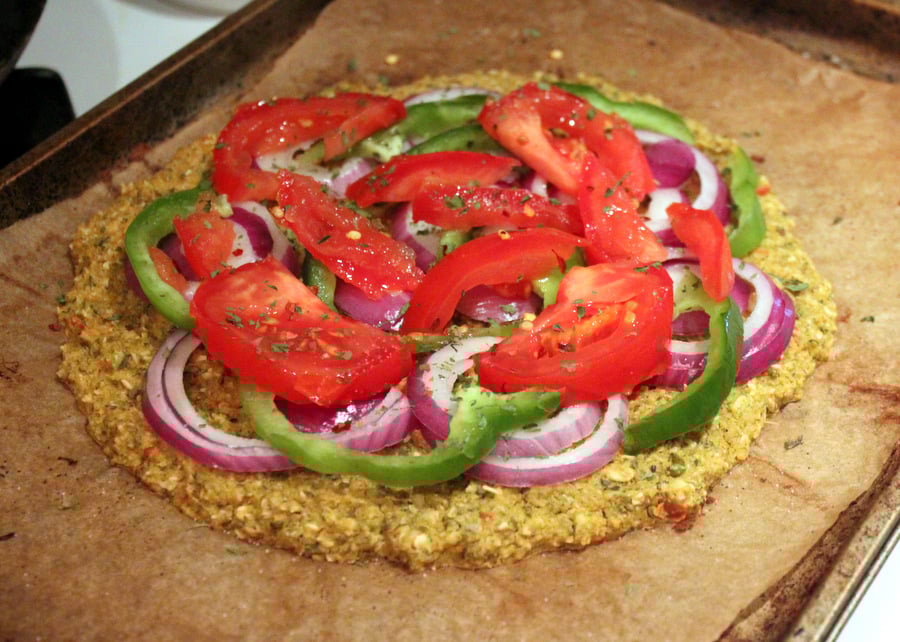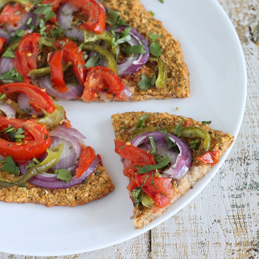 Spicy Mung Bean Sprout and Spinach Crust topped with red onions, bell peppers, tomatoes, cilantro