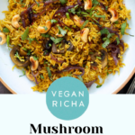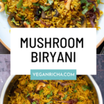 Delicious vegan mushroom biryani in the Instant Pot. Mushroom biryani is an amazing vegan version of chicken biryani made with meaty mushrooms, tender fluffy rice, and flavorful spices. Perfect for weeknight meal! Add some chickpeas or beans for added protein. Vegan Gluten-free Soyfree Recipe, Nutfree option. Stove top instructions included