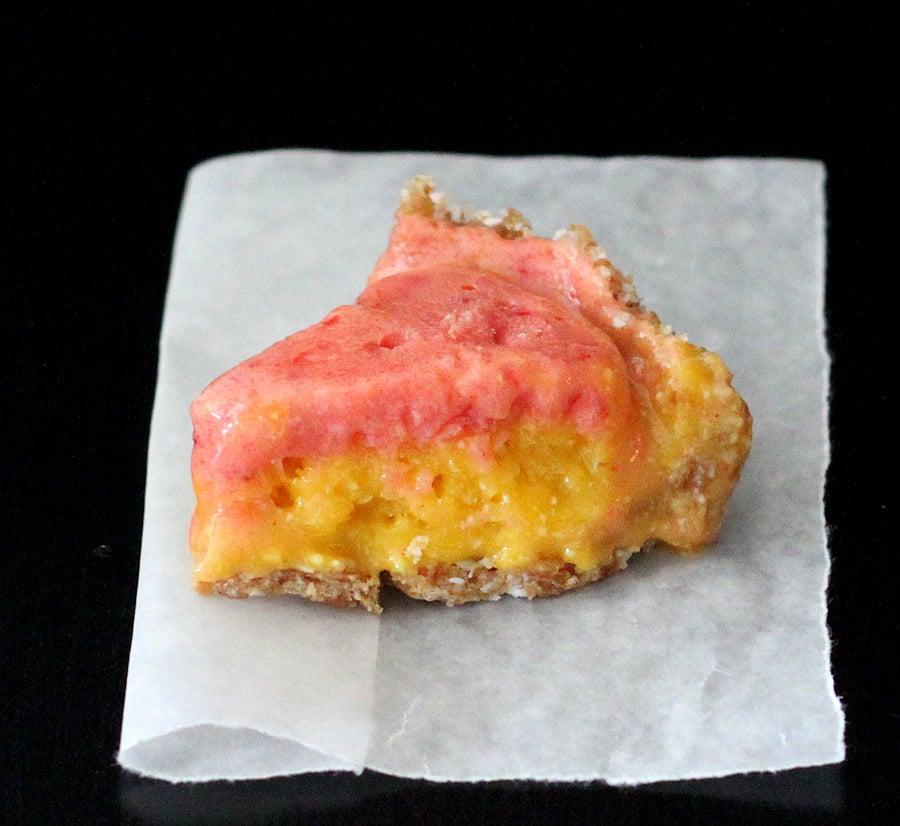 - Take the crust out. Layer the mango and beet cream to preference, marble or swirl it.