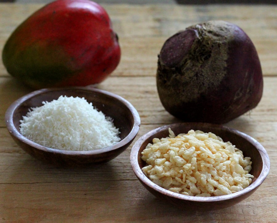 Grate beets and then blend with ground cashew, coconut flakes, sugar and water. Bring to a boil, cool, swirl into the mango cream.