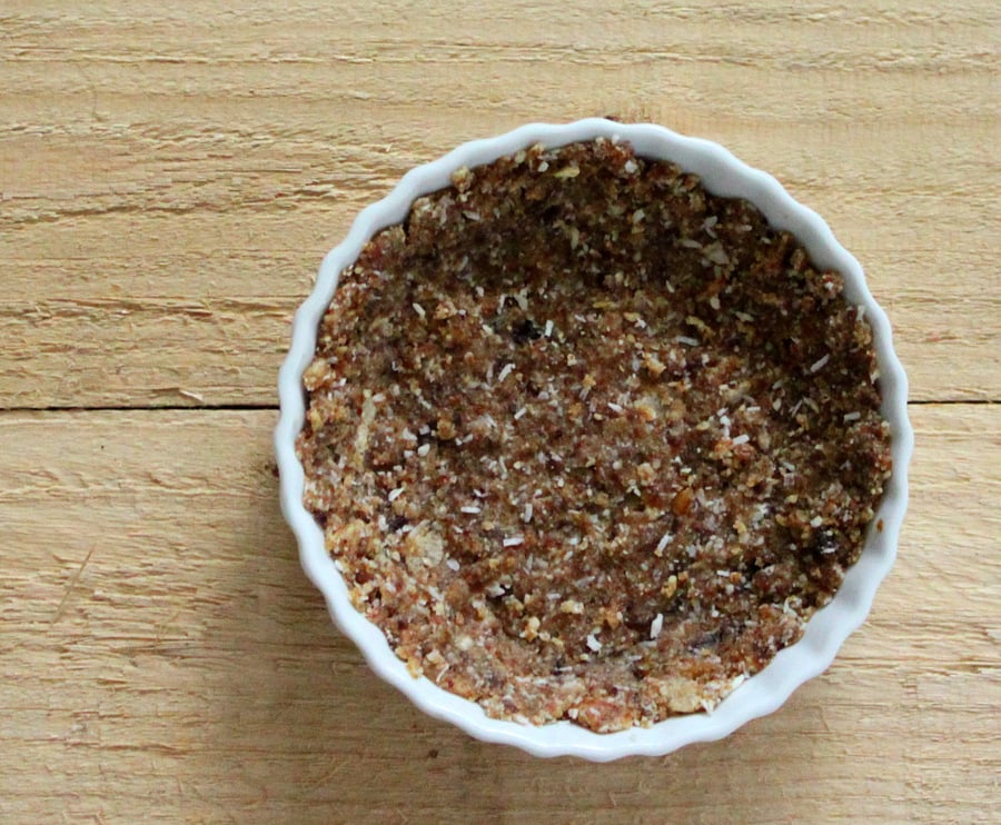 Pulse dates, ground almond, coconut and rice cereal. Press into tart pan