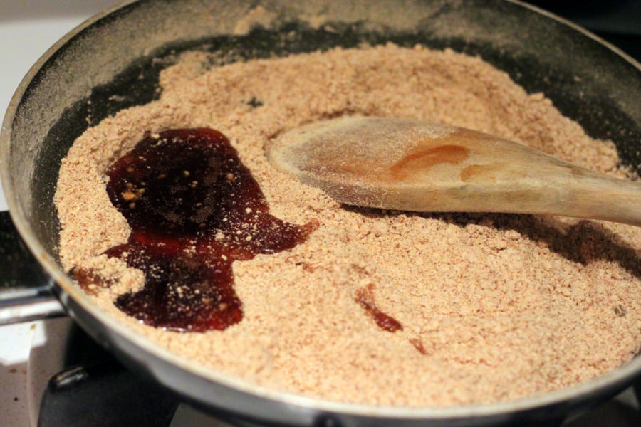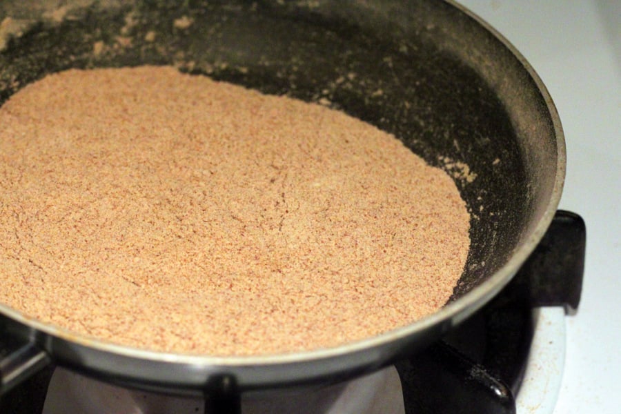 Once the wheat flour gets lightly browned and you can smell the roasted aroma, add in the ground sugar, cardamom and almond flour and mix well.