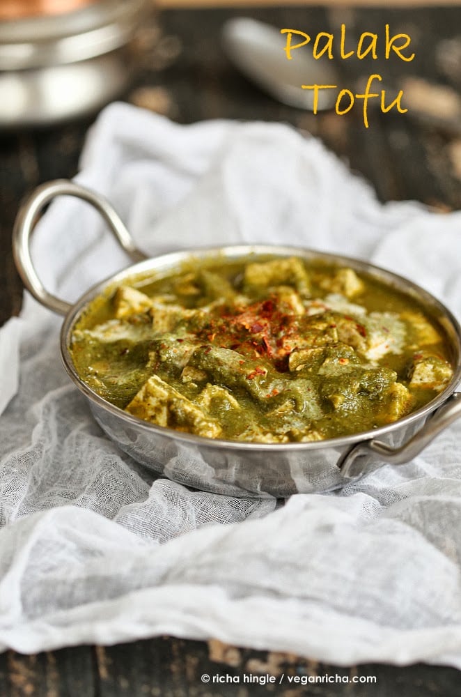 - Meanwhile, wash the fresh spinach and add it and all the other ingredients under Spinach curry except garam masala to the blender. Blend into a smooth puree. Add the puree to the sizzling tofu. Mix well. Add garam masala to taste. Cook covered on low-medium heat for 10-15 minutes or until the raw garlic smell is not detectable and desired sauce consistency is achieved. Taste and adjust salt and spice.