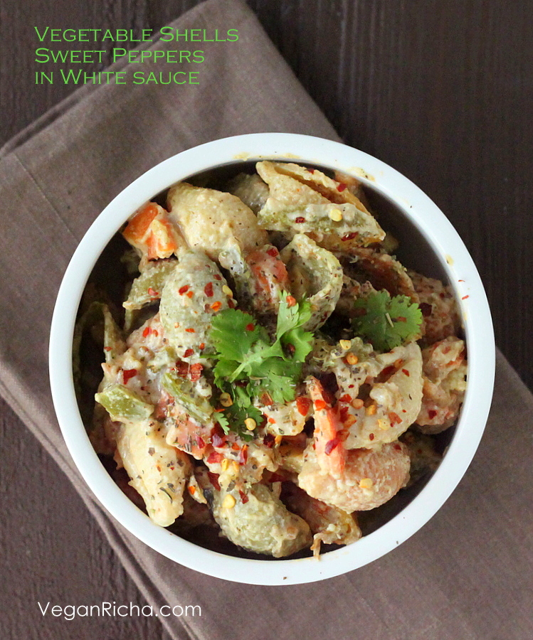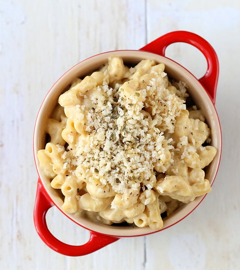 Top the pasta with non dairy cheese shreds or bread crumbs mixed with herbs, salt and olive oil.ย