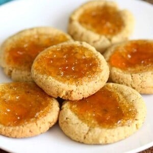 These thumbprints have raw pistachios to make them buttery, soft and melt in your mouth and apricot preserves filled in their center. Make these with your favorite summer fruit preserve. Easy, all whole grain and addictive. To make these gluten-free, use a gluten-free flour blend or use oat flour like in these Gluten free Vegan Chocolate Chip Cookies.