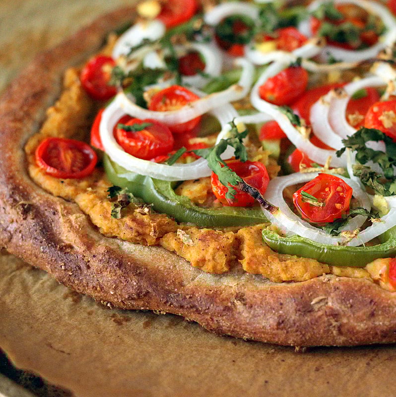 Chana Masala Hummus, cherry tomatoes and veggies on a rustic Wheat crust.
