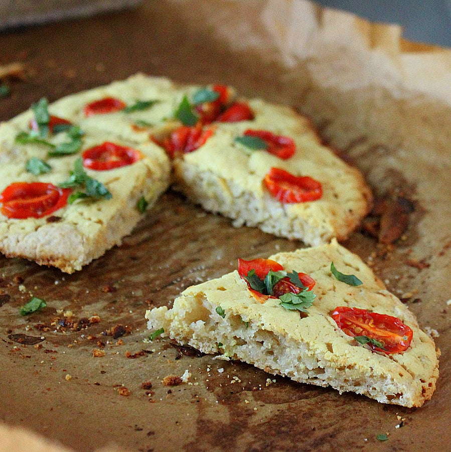 Chickpea Quinoa Chard crust topped with roasted cauliflower and tomatoes. GF yeast-free