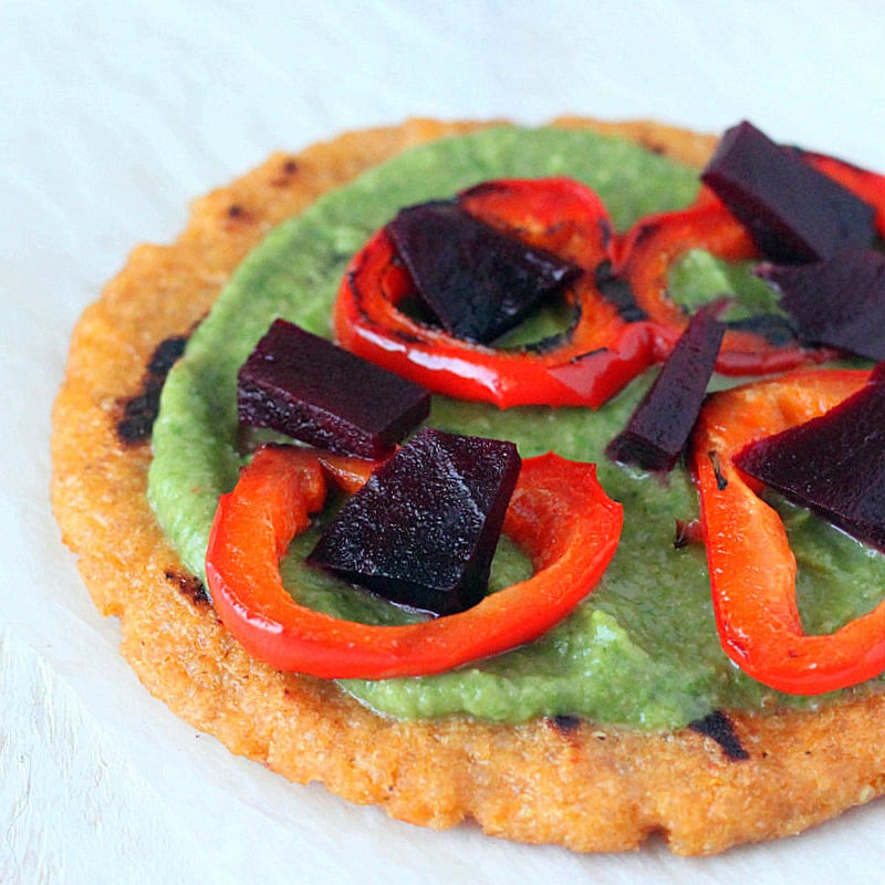 Quinoa Oat Flat bread Mini Pizza with Spinach hummus, Roasted Beets and Red bell pepper. Glutenfree gumfree