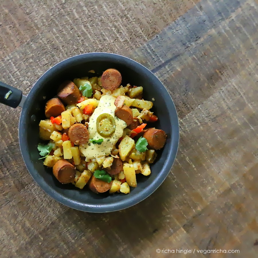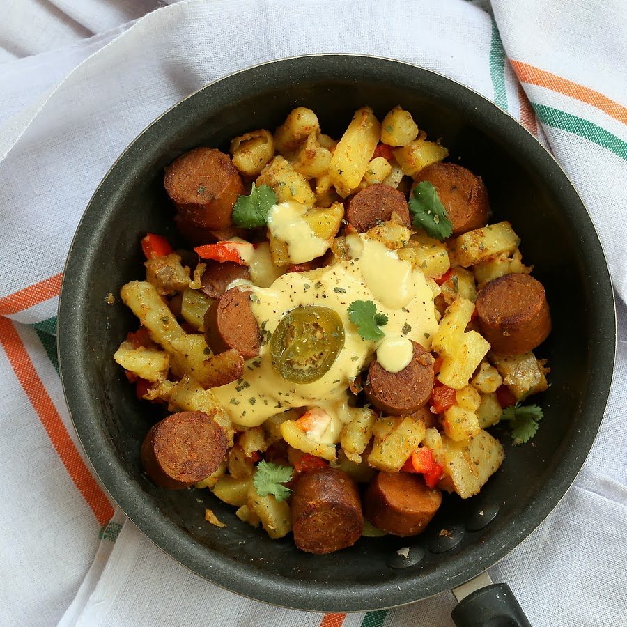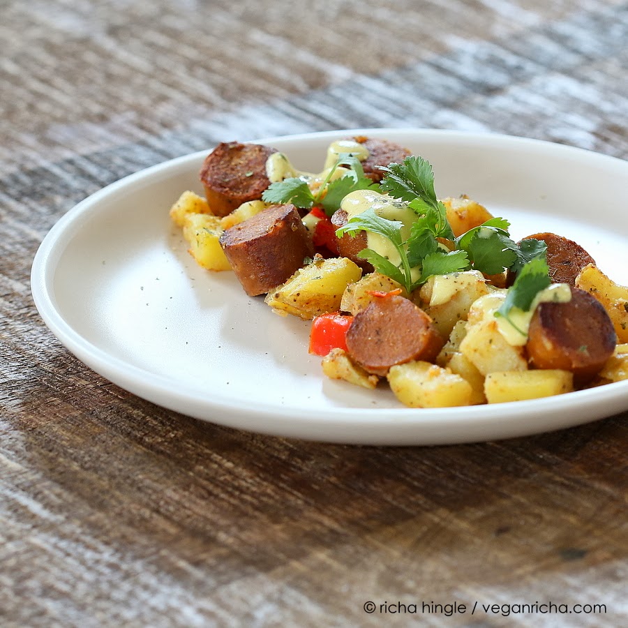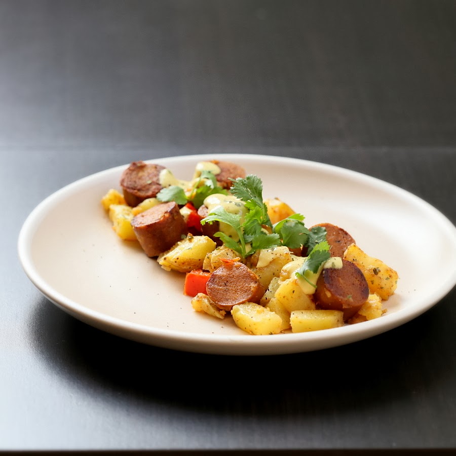 In a pan, add oil and heat on low-medium heat. Add potatoes, toss, cover and cook for 10-12 minutes until potatoes are tender crisp. Stir once in between. In another small pan, add a tsp of oil and heat on medium. Add the sausage and cook until brown on the edges. Add the bell pepper and sausage to the potatoes. Add salt and spices and mix well. Cook without cover for another 10 minutes. Stir 2-3 times in between. Check to see if potatoes are done. Add lemon juice and black pepper and serve hot with a dollop of the mustard mayo, cilantro and pickles or pickled jalapeno.