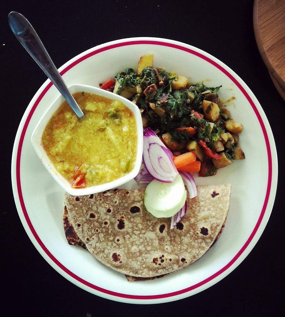 Thats Dad’s Indian food plate below. One veggie side, one dal, flatbread, sliced up salad veggies. Sometimes there is pickle and papadum on the side too.