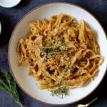 While the pasta and pumpkin alfredo sauce cook together in one pan, you make the crispy, rosemary breadcrumbs to sprinkle on top. They’re such a lovely contrast to the creaminess of the pasta and really make this pasta dish special.