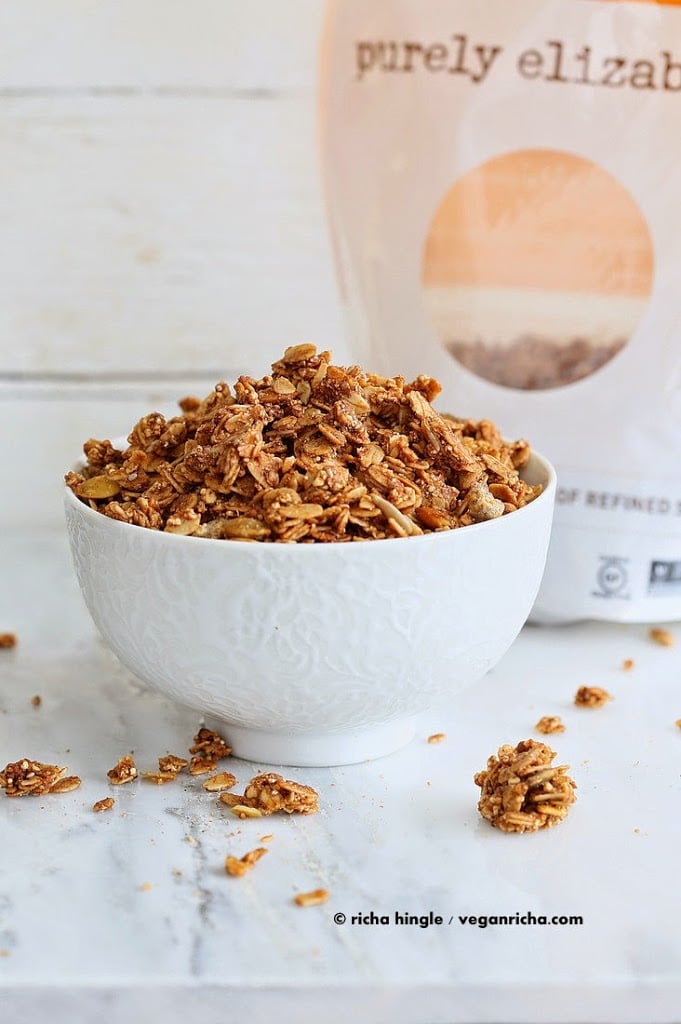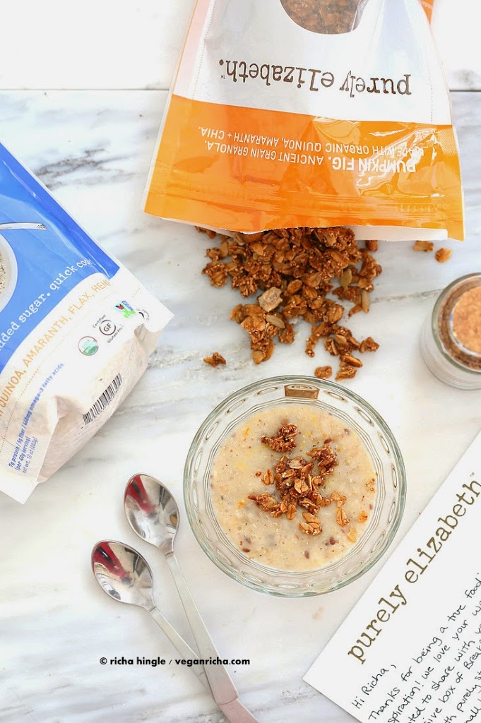 Purely Elizabeth sent me a pack of their ancient grain oatmeal and Pumpkin fig ancient grain granola to review. The package was beautifully packed with care and smelled wonderful. All of the Purely Elizabeth products are certified gluten-free, organic, vegan, non gmo. They are also refined sugar free, use ancient grains, use nutrient dense ingredients and are simple and delicious.