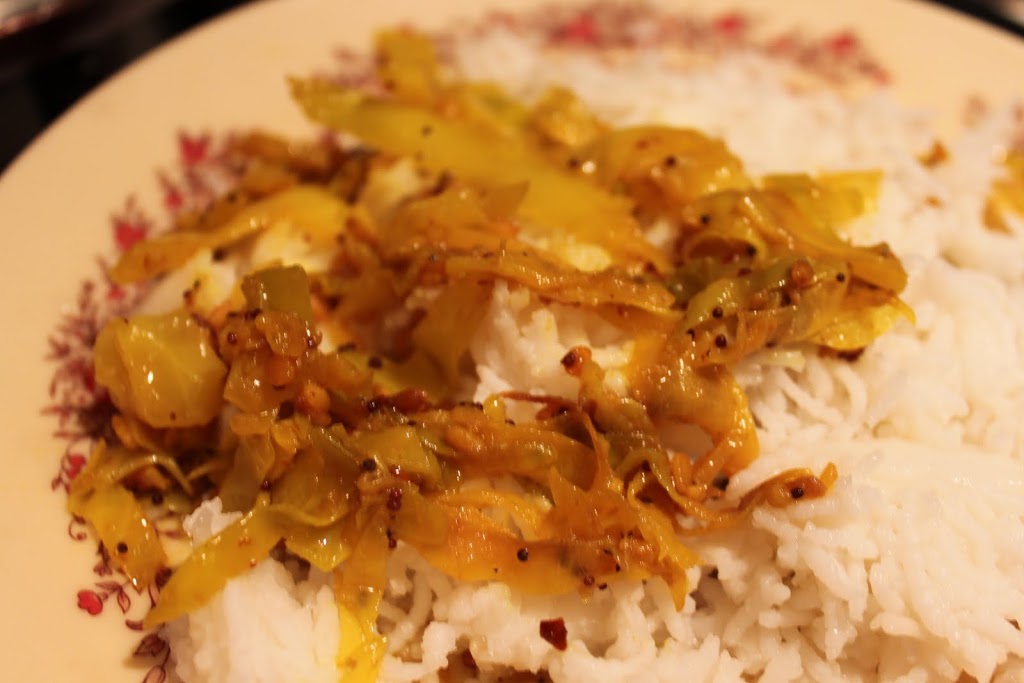 Cabbage is another one of the frequently used vegetable, for Indian main course dishes in our house. Right after cauliflower and potato. This dish is one of the quick stir fry versions with some garlic, mustard seeds and yellow mung lentils.