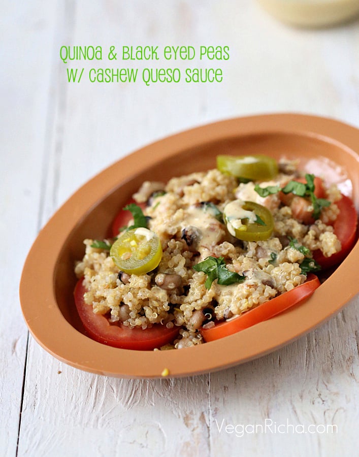 I had been postponing trying a queso and when I saw it in the book I decided to make some. Quinoa with Black eyed peas and some Cashew Queso sauce. Because I have cooked Black eyed peas easily in the kitchen 🙂