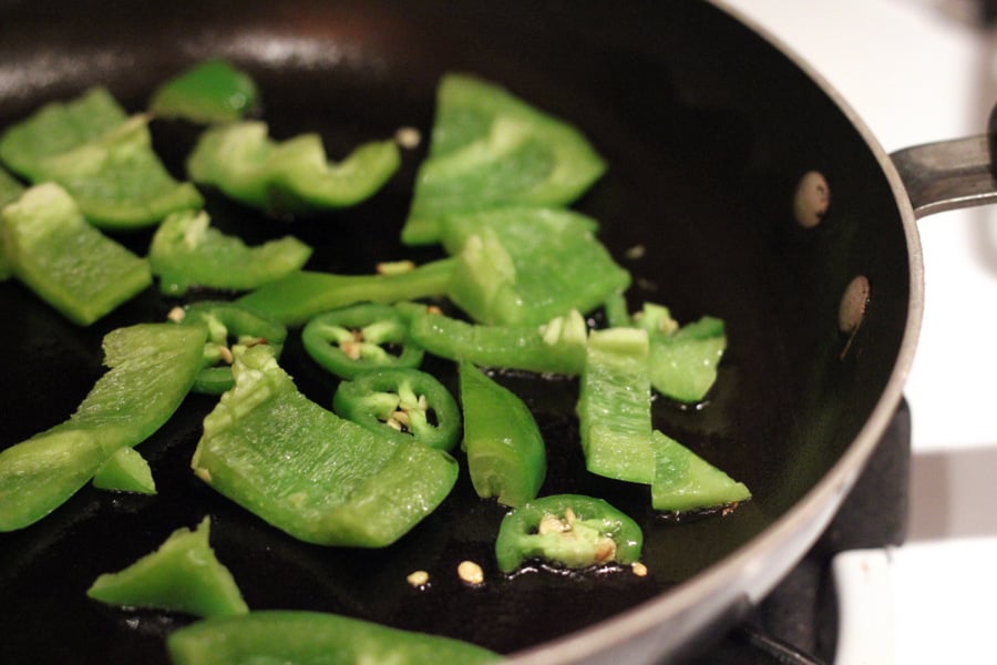In a pan, add oil, bell peppers, jalapenos, cook for a bit.