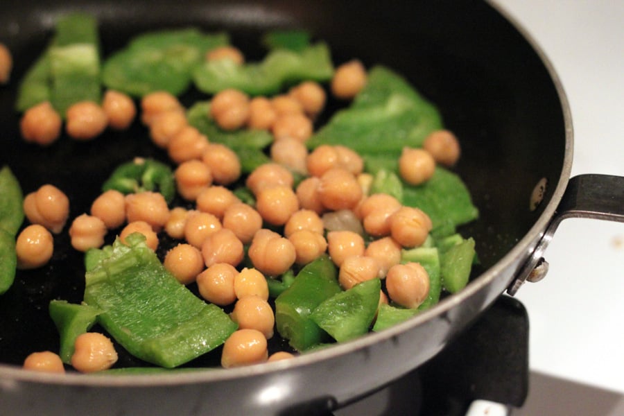 Add a few Tablespoons of water or broth, herbs, chickpeas and bring to a boil, uncovered. Simmer if needed to reduce.