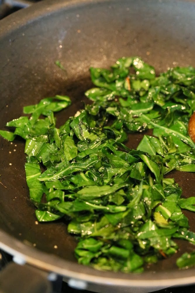 - While the cauliflower roasts, heat oil in the pan on medium heat. Add the collard greens, salt and garlic and cook for a minute. Add the water, mix, cover and cook on low-medium heat until lightly wilted.