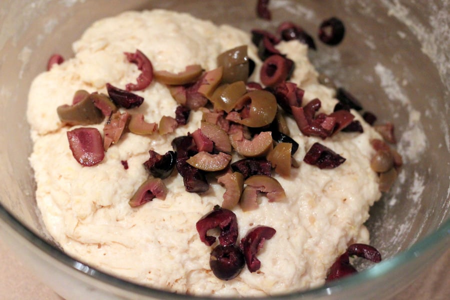 Add chopped olives, sprinkle 2 Tablespoons of bread flour on the dough, oil hands and gather and knead the dough for 2-3 minutes.