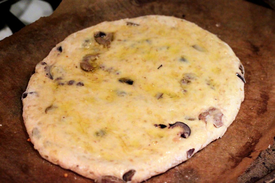 Spread generous amount of evoo on top. Make dimples in the dough if you like.