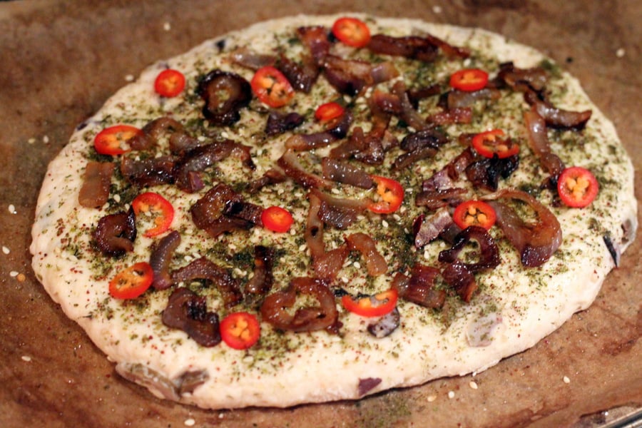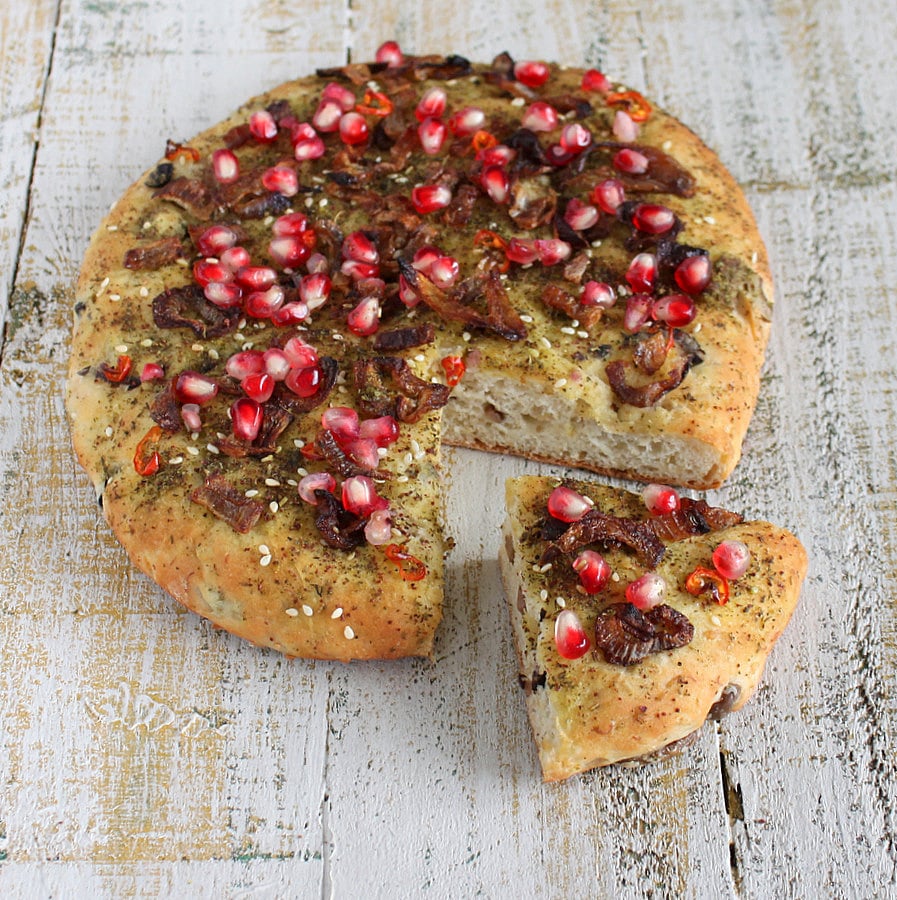 The blend is sprinkled liberally over this soft focaccia crust along with extra virgin olive oil. Then loaded with Caramelized onions, red chili pepper slices(which are of course optional), and fresh pomegranate arils. A delicious snack or a light meal or a side.