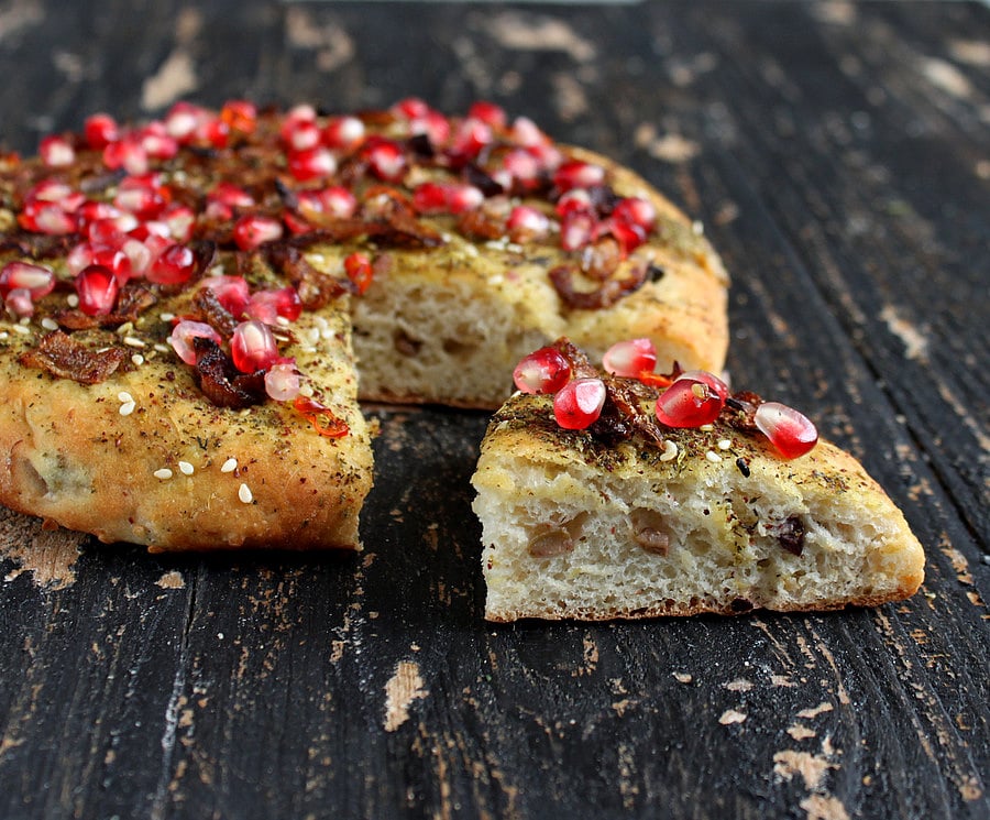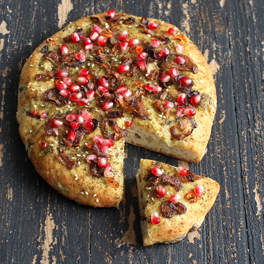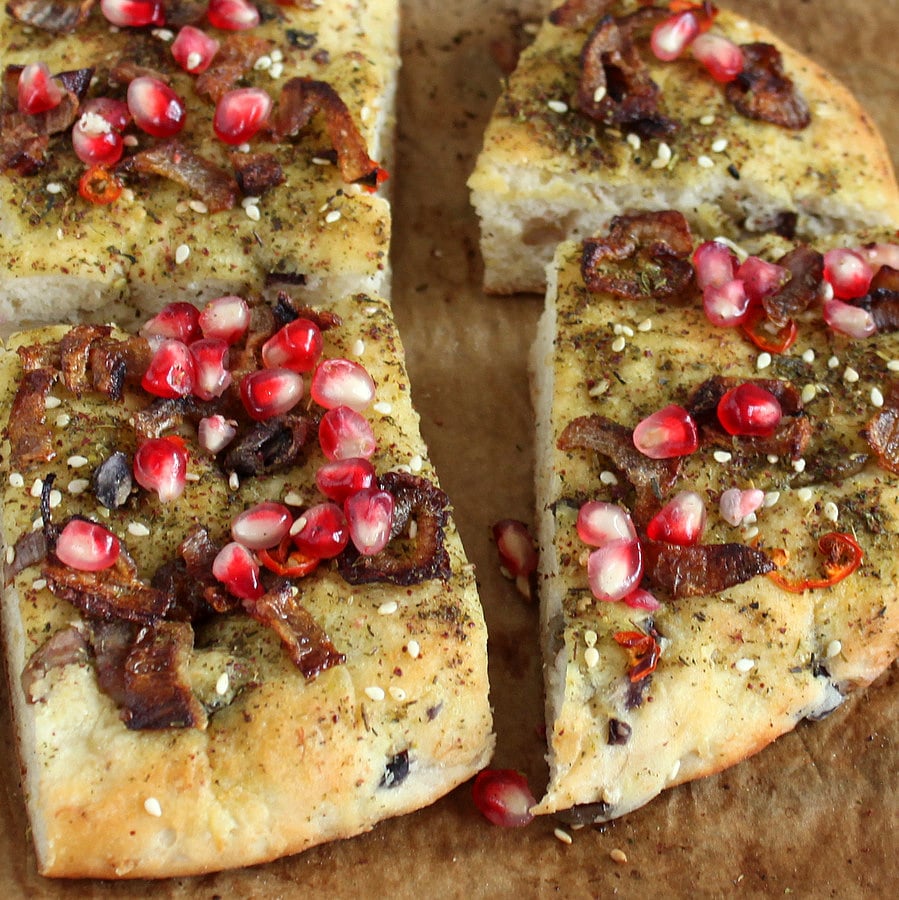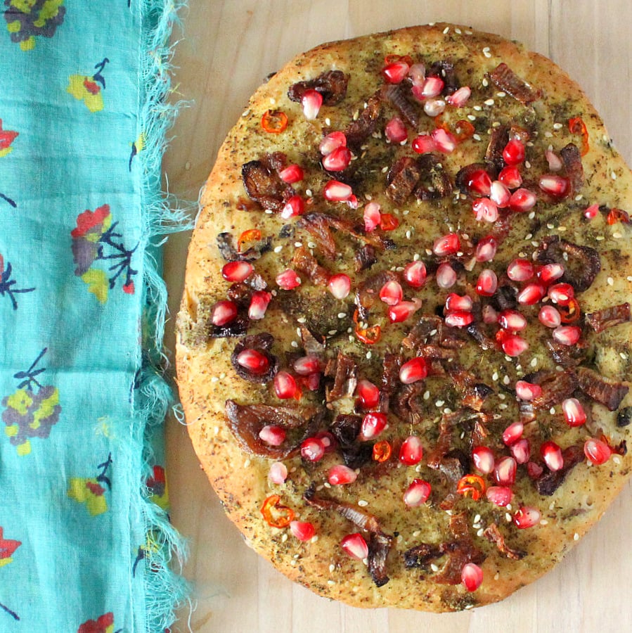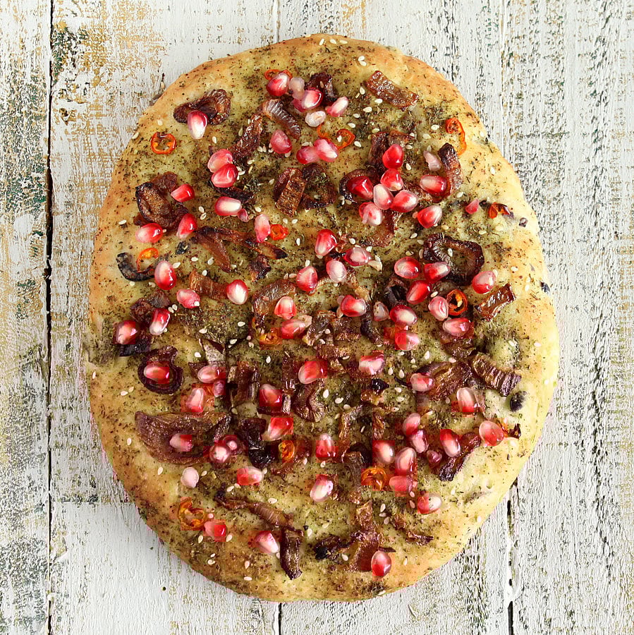 Quinoa Olive Focaccia Crust Pizza with Zaโatar, Caramelized Onions and Pomegranate arils.ย