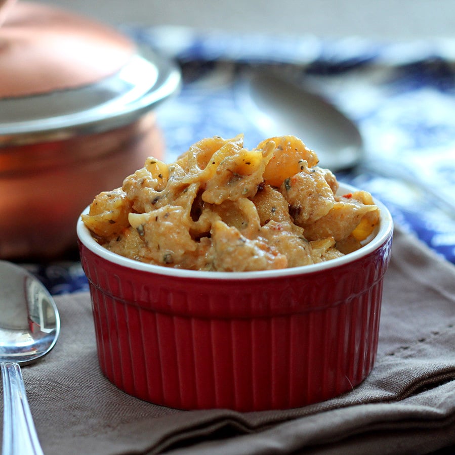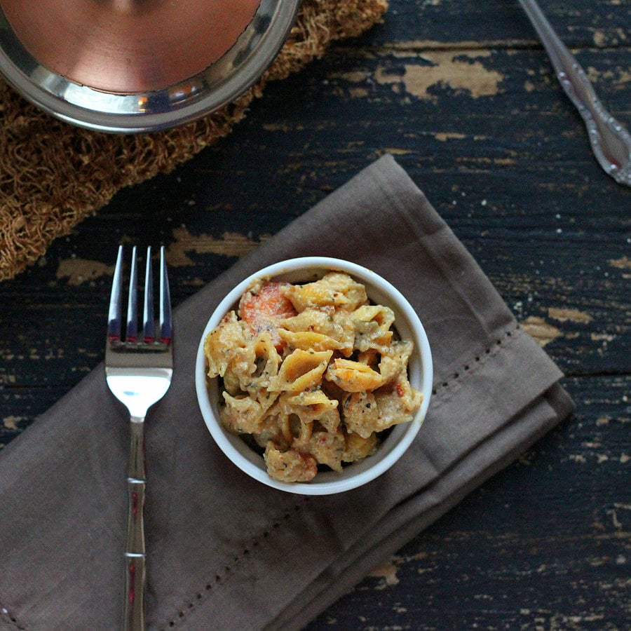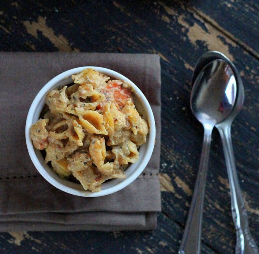 This creamy spicy sauce with the sweet veggies works out just perfect for a weeknight quick meal. Change up the veggies, top it with cheese, double up the recipe.