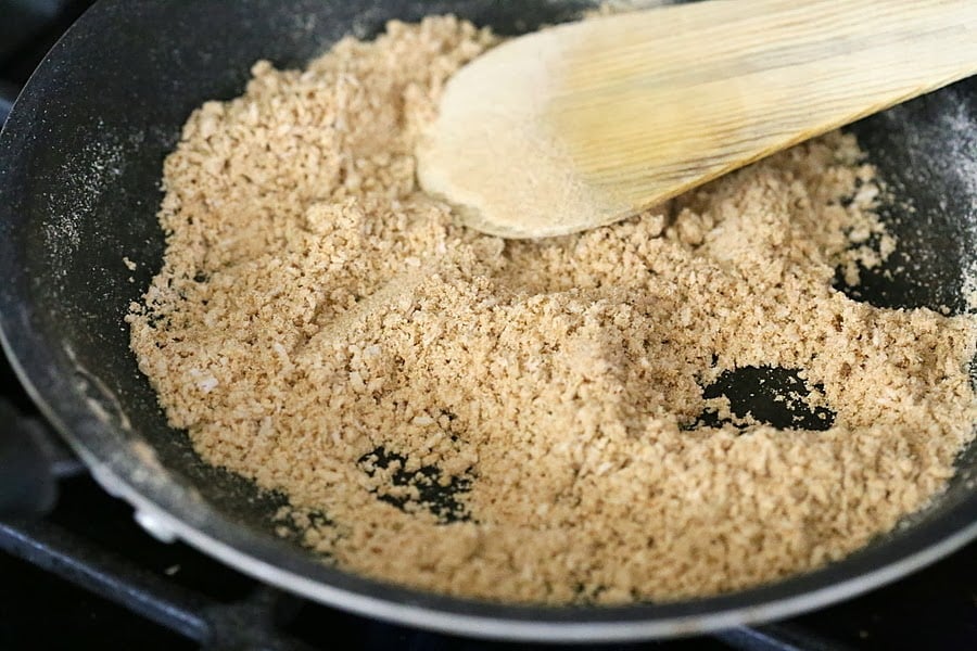 Reduce heat to low-medium. Add coconut flakes, salt, and chai masala/cardamom(omit if using vanilla). Roast for another 1-2 minutes so the coconut flakes release some oil. Mix well.