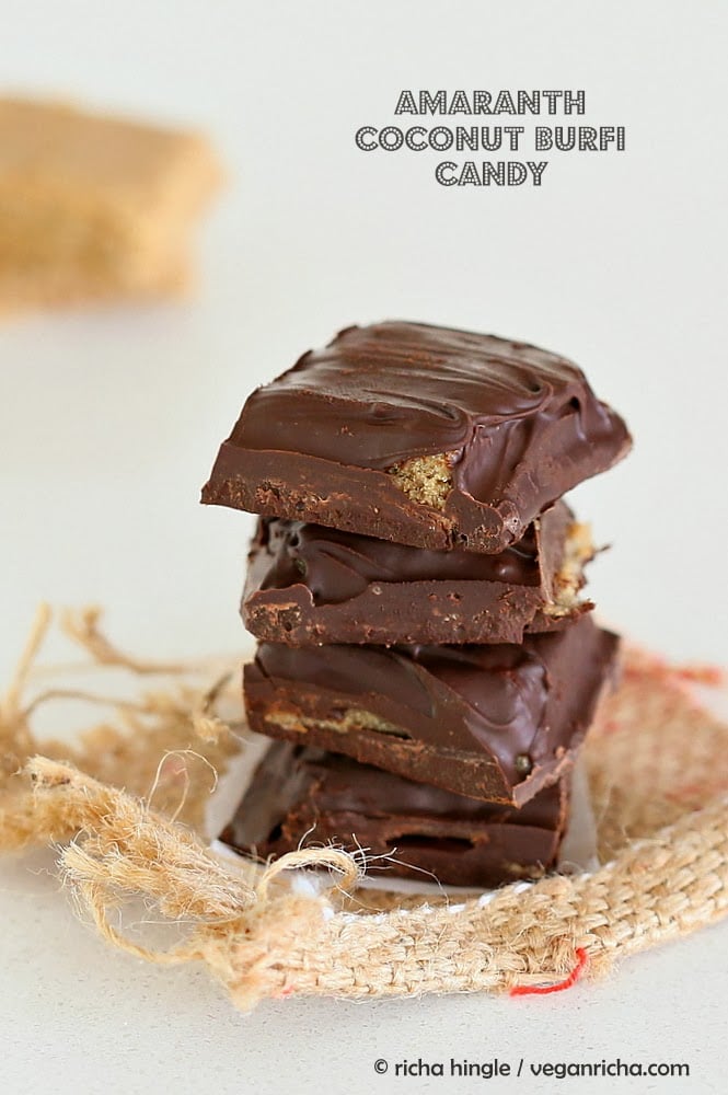 Melt vegan chocolate chips(about a cup for the entire Burfi batch) in a double boiler. Once the chocolate is smooth and shiny, dip each squareย fudgeย in the chocolate and place on parchment. Or spread a thin layer of melted chocolate on parchment. Place the fudge squares on the chocolate, a 1/4 inch distance apart. Spread another layer of chocolate on top with enough so that it trickles between the squares. Let cool completely in theย refrigeratorย for an hour. Cut up and store.
