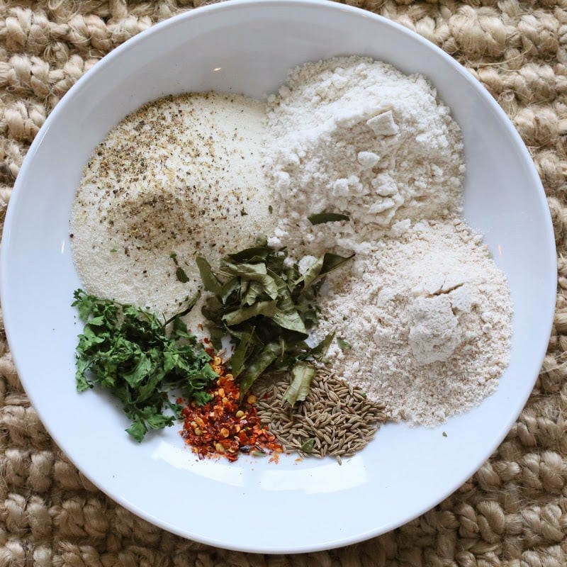 Notes: to make dried cilantro or curry leaves, spread them on a baking sheet and bake at 225 degrees F for 15 minutes to half an hour. Or you can also add fresh cilantro the Dosa batter. Curry leaves can be bought fresh or dry at amazonย or from an Indian store.ย For detailed Step pictures and potato masala recipe, see the Gluten-free Rava dosa post here.