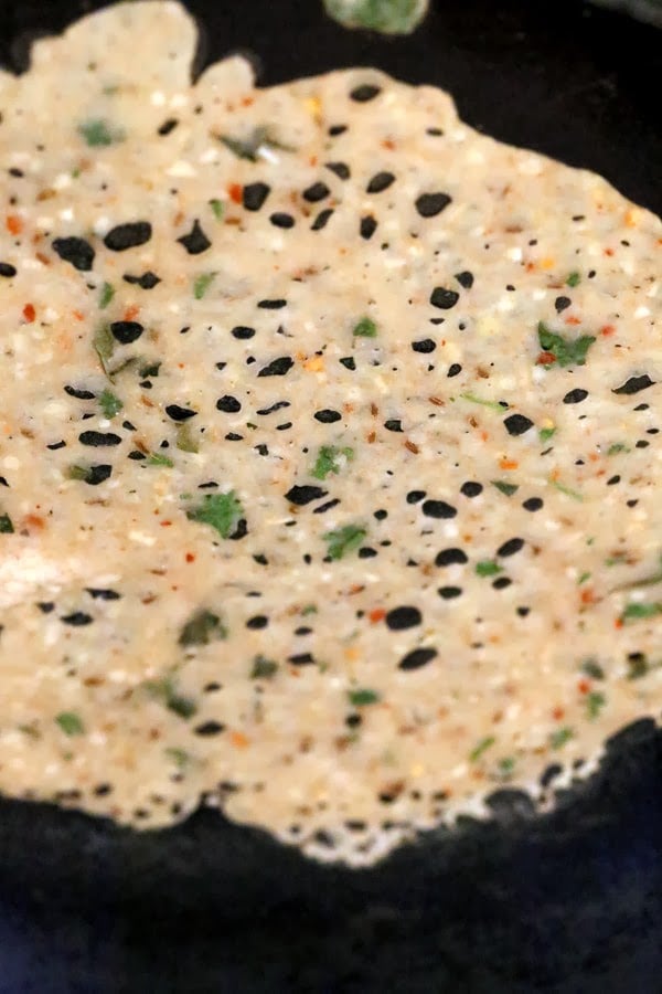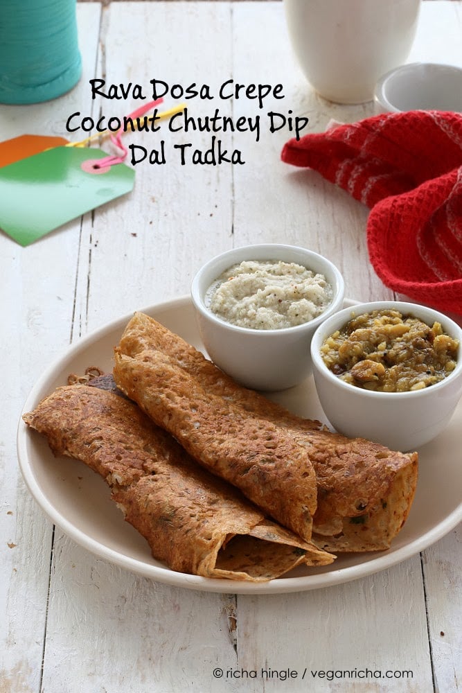 Rava Dosa Crepe is the easiest of the lot. It uses rice flours, semolina, spices and needs about 15 minutes of prep time. Then the batter is used to make crepes which are best served hot.