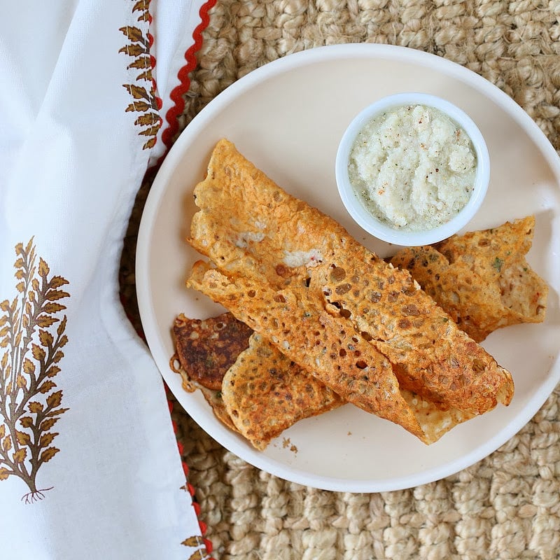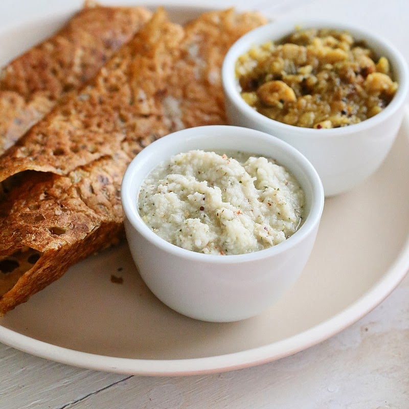 Both the recipes today are easily flexible to taste. Add greens or finely chopped veggies to the dosa batter for variations. Add roasted garlic, roasted red bell pepper, or jalapeno, mint, cilantro or roasted peanut to the Chutney for variations.ย