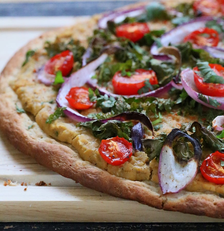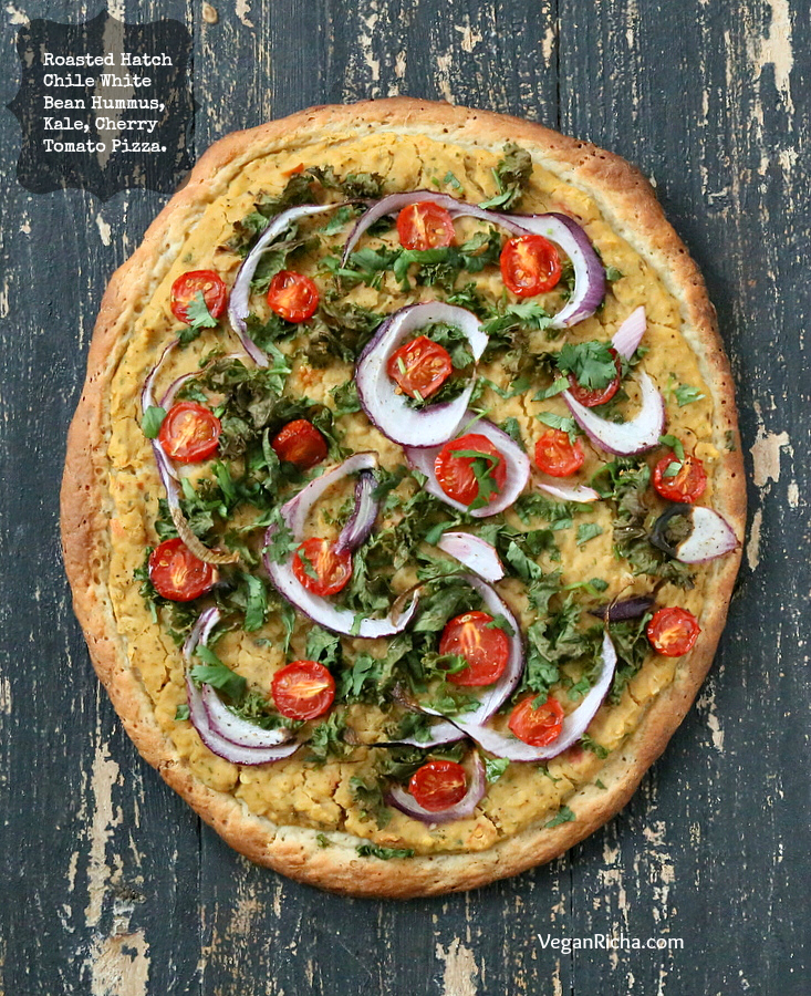 Roasted Hatch Chile White Bean Hummus, Kale, Cherry Tomato Pizza.