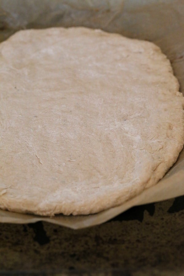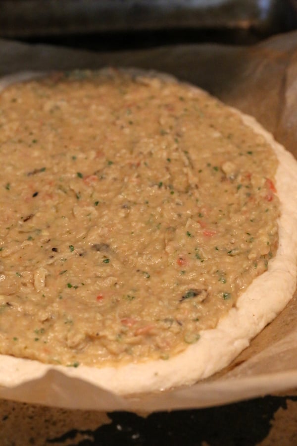 Spread all the hatch chile hummus on the dough into a thick layer.