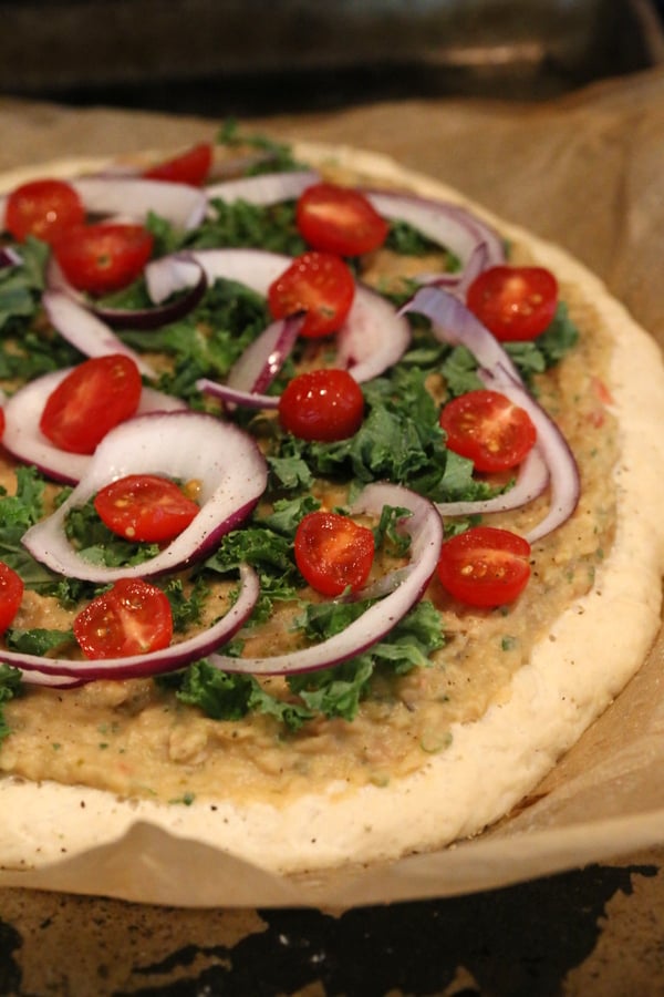 Made this pizza about a week back with a soft Quinoa and bread flour crust, topped with a spicy cheesy hummus made with hatch chilies, smoky paprika and Northern white beans. Topped with the favorite cute cherry tomatoes, some Kale and red onions. No cheese needed. Yum!
